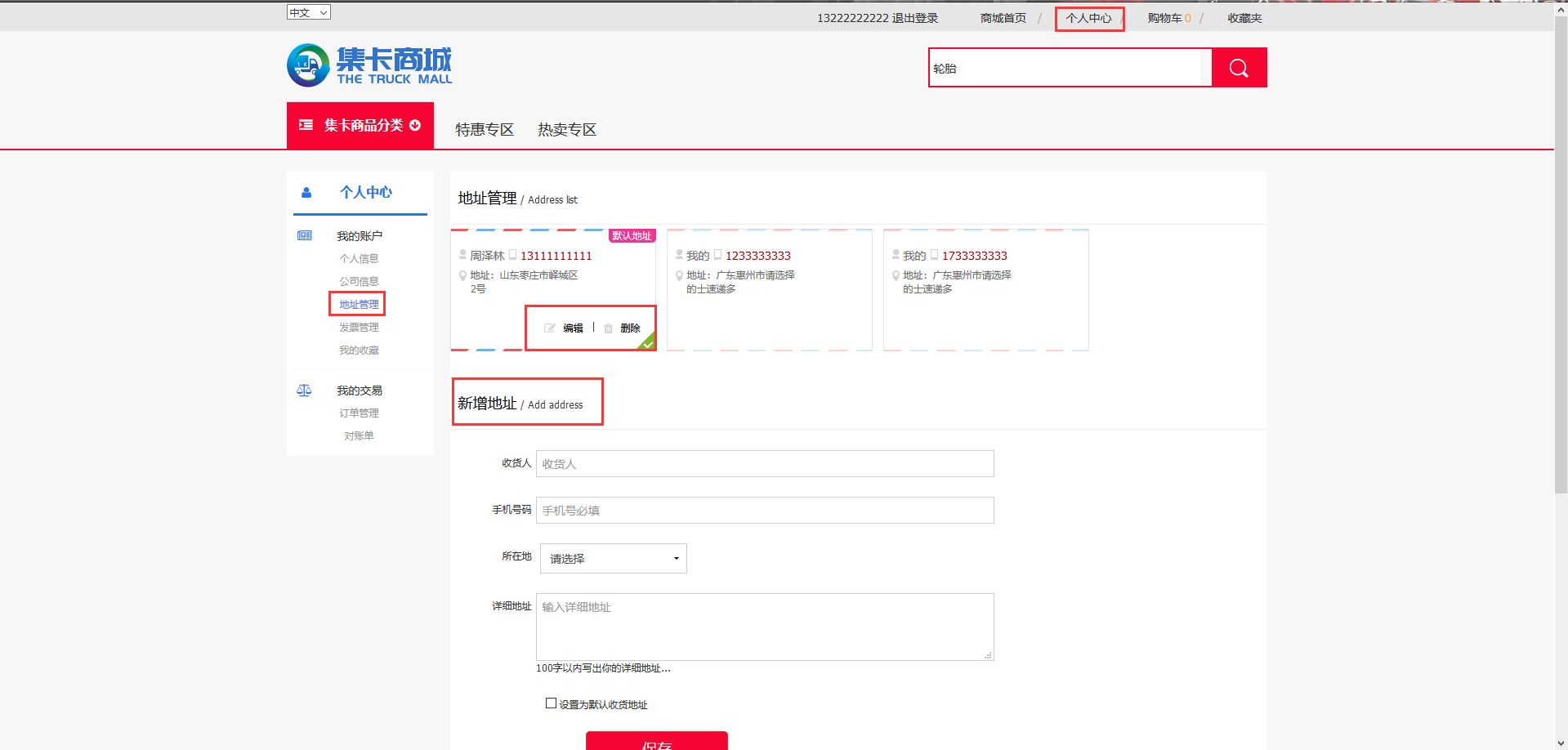 点击个人中心,选择地址管理,可以在此界面进行地址的新增、编辑和删除。(如下图)